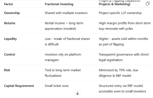 But if you want to maximize returns, participate in short-term cycles, and be part of a transparent, legally structured business model, Property Flipping with Jayashree Projects & Marketing is the smarter choice.