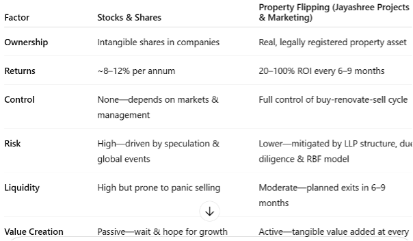 - But if you want 20% to 100% ROI within 6–9 months on real, tangible assets, then Property Flipping with Jayashree Projects & Marketing is the smarter choice.